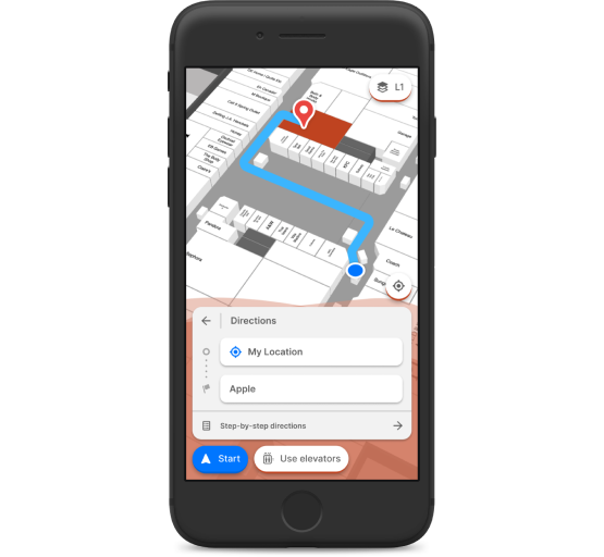 Pan, zoom, and rotate 3D mall maps to get acquainted with your indoor location as well as the property. As the map moves, so do dynamically displayed elements such as text labels. These features, along with accessibility mode, provide a seamless indoor navigation experience for all shoppers.